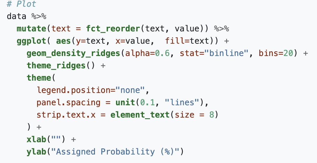 When you click one, you’ll see several examples of that type of plot, for example ridgeline, and when you click on one of those it will show you all the code that was used to make that plot.
