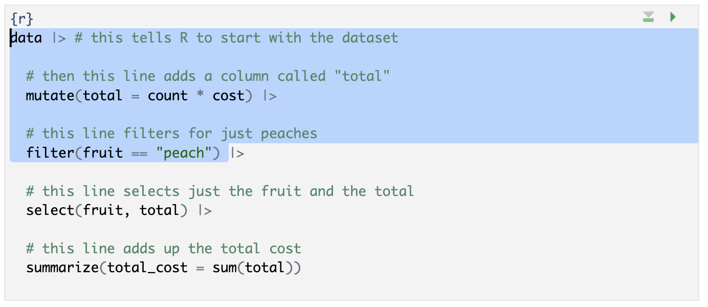 Now let’s say we want to find out the total amount of money we are going to spend on peaches. Here’s our workflow using the pipe operator. (We’ll learn three of these functions today and summarize() next time.)