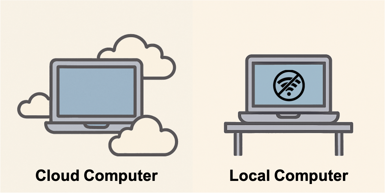If throw your computer into a river, you will lose everything that is stored locally. You cannot throw the cloud into a river, so even though your computer is now aquatic, anything you have stored in the cloud will be retrievable on a new computer. However, if you are wandering in the desert without any internet connection, you will only have access to everything that is on your local computer but not anything stored in the cloud. You will need to download your music ahead of time to have a soundtrack for your wanderings.