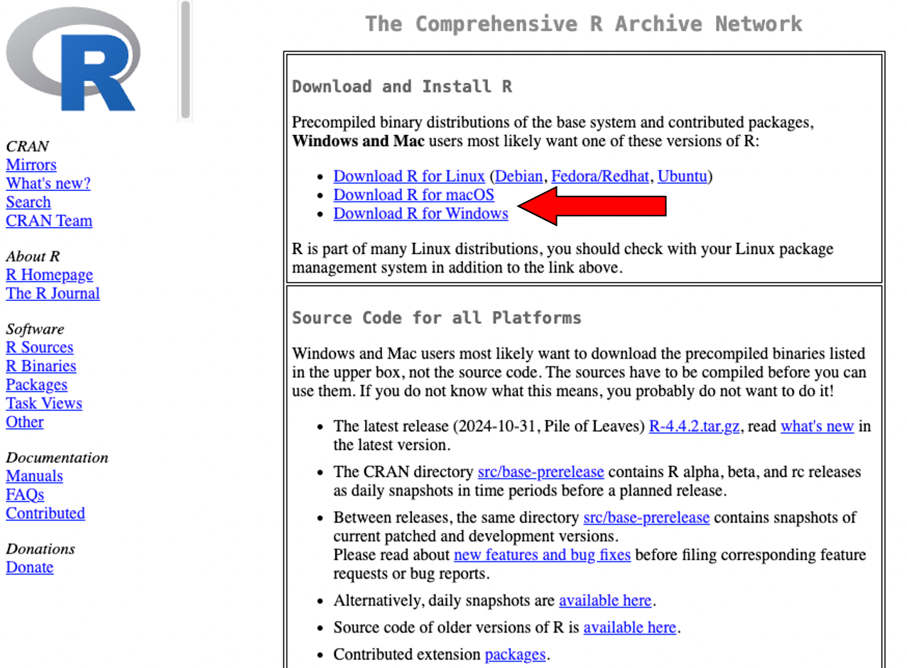 To download R, go to the CRAN (Comprehensive R Archive Network) page and under Downloads, choose the correct version for your computer, likely Mac or Windows. Then, if you are a Windows user, click “install R for the first time”. If you are a Mac user, you will see a list of available versions of R depending on your operating system, but frequently the top download is what you want. For both Mac and Windows, double click and install R after downloading.