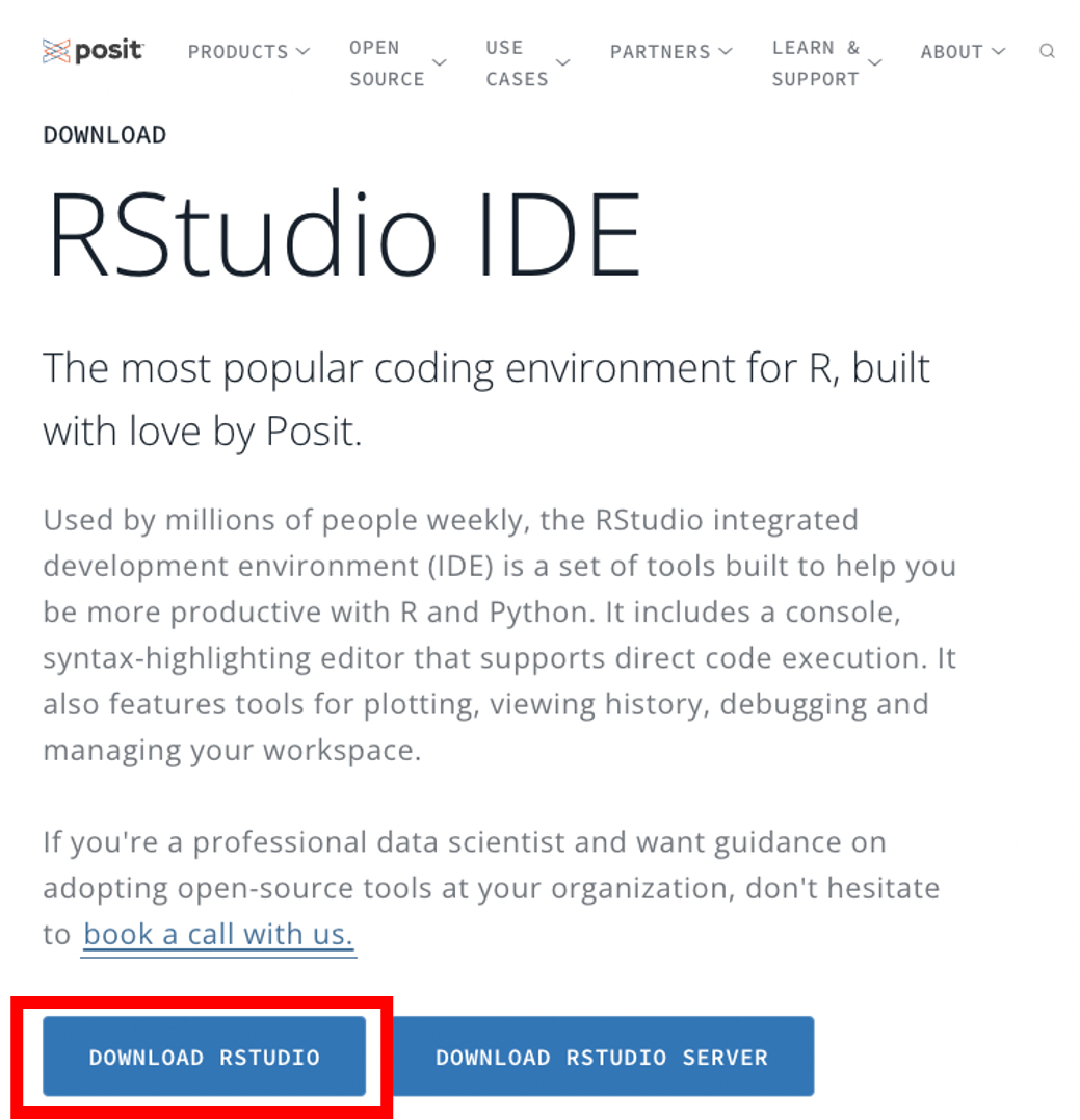 Next, download RStudio from the Posit website. This website should recognize the correct version for your computer and will give you a single download button. It will also give you a link to download R if you haven’t already done so. Install RStudio after downloading by double clicking the icon and agreeing to the terms.