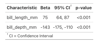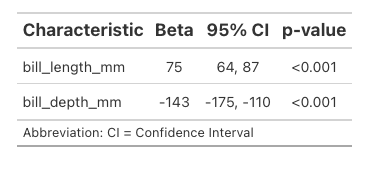 Where {gtsummary} really shines is taking the ugly output of model summaries and putting them in a readable format. Here’s a linear regression of body mass as a factor of bill length and depth. You’re maybe already familiar with the hard to interpret basic summary.