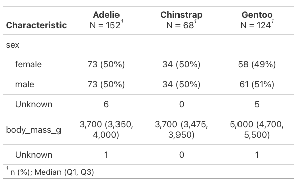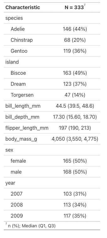 tbl_summary(na.omit(penguins))Summary Tables