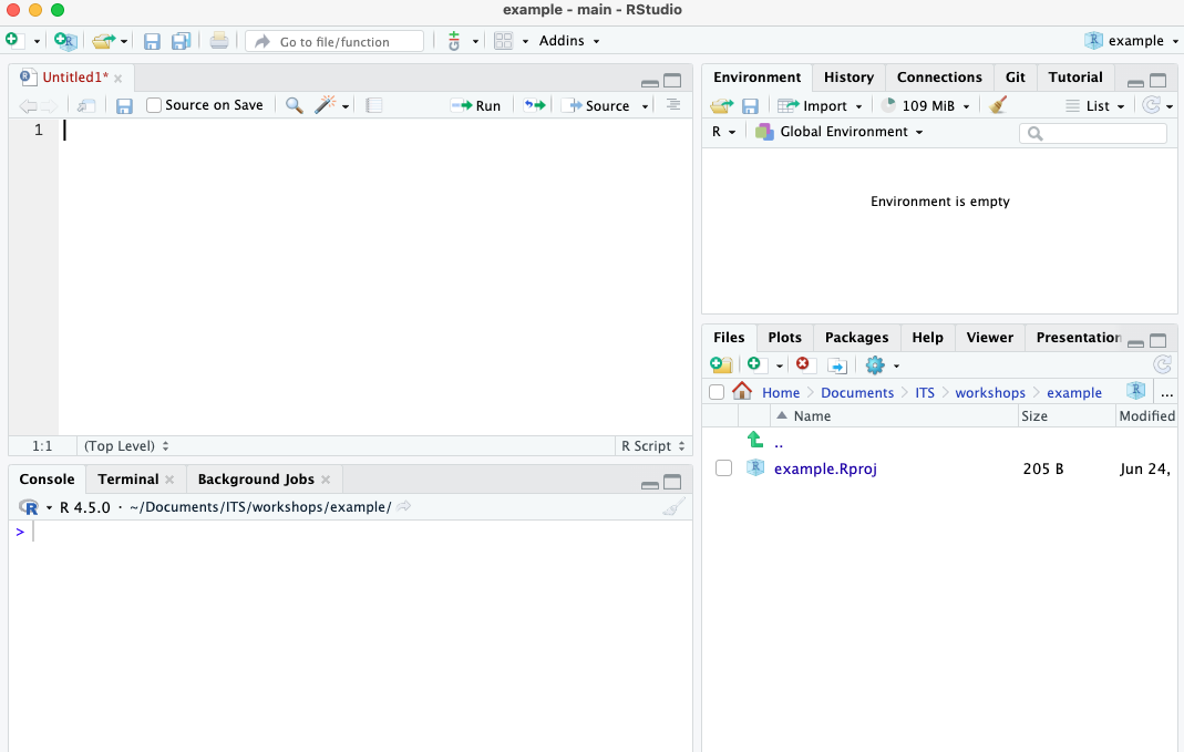When you open a new project you will see a screen that looks something like this. It will contain the project file, but nothing else yet. You’ll then want to make sure that you add the data file to whatever folder the .Rproj file is in. That should just be the name of the folder you made for the project, so here mine is called “example”.