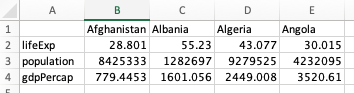 Here’s an example of untidy data, which we also sometimes call wide format data. It is often the easier way to initially write data down. A key signal to know if you have data in wide format is if there is an empty cell at the top left.