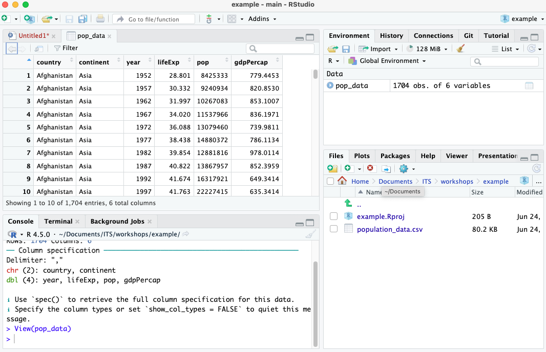 Once you’ve successfully run the read_csv() function you should see that the name pop_data appears in the Global Environment in the top right pane. When you click that name, you can view the data and it will pop up in a spreadsheet format. Note, however, this spreadsheet is not directly editable.