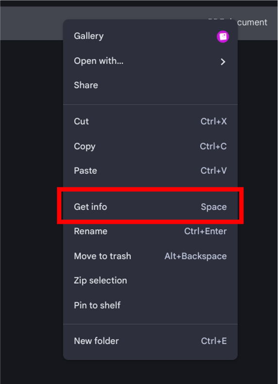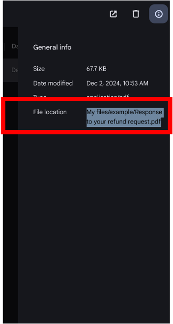 Open whatever the Chromebook version of Finder or Explorer is and find the file by navigating to it or searching for it by name. Right click on it and click Get Info . This brings up another window that shows the file path under File location. Copy and paste the full name from there.