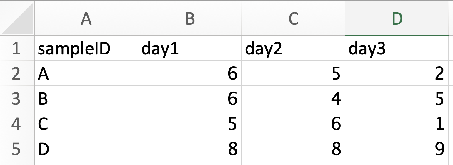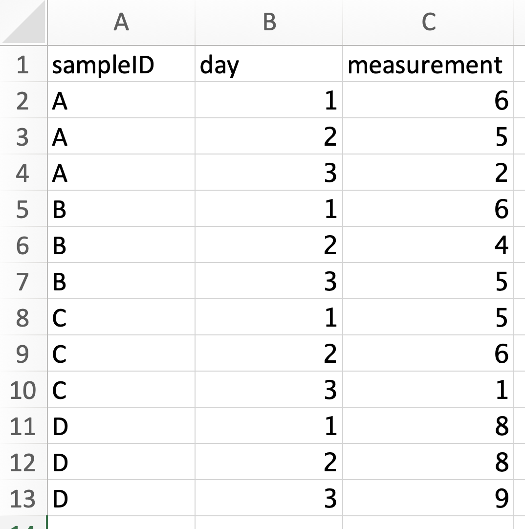 The wide format table is more commonly used when you are creating your own datasheet because it’s easier to enter data in wide format. You can see that there is a lot less repition in the wide data. But the long format is often much easier to analyze. In long format, every row contains all the information for a single measurement and each column represents the same type of data. Long format data is also frequently referred to as “tidy data”.