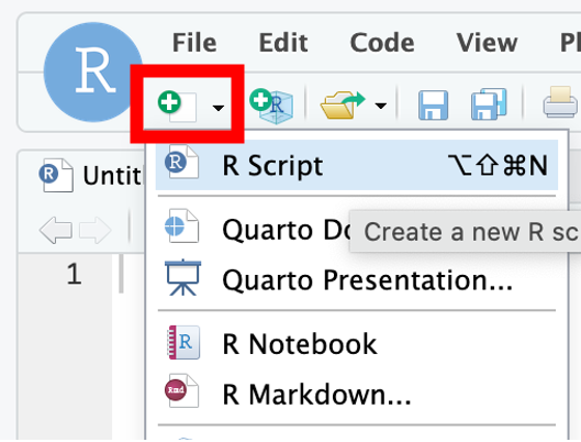 When you first open a project you will only see three of the four panes. This is because you have yet to open a script file. To do that you click the little green + in the upper left, or go to File > New File > R Script.
